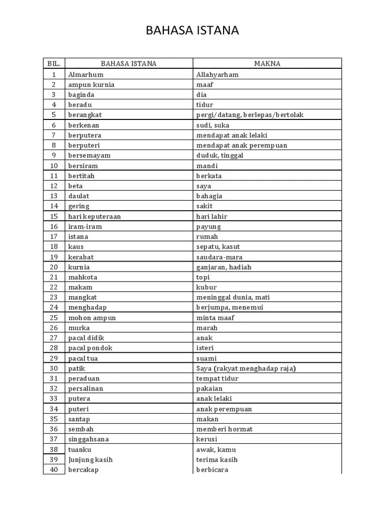 Kamus Bahasa Istana Dan Maksud / Bab 4 Nor Amirah Binti Rosman. 1, anak, paduka anakanda, pacal didik. 2, ayah/bapa, paduka ayahanda, hamba tua ayah. Lagi gambar yang mengandungi tambahan bahasa istana untuk anda teliti dan fahaminya. Bahasa istana bahasa biasa murka marah patik saya (rakyat menghadap raja) peraduan tempat tidur.